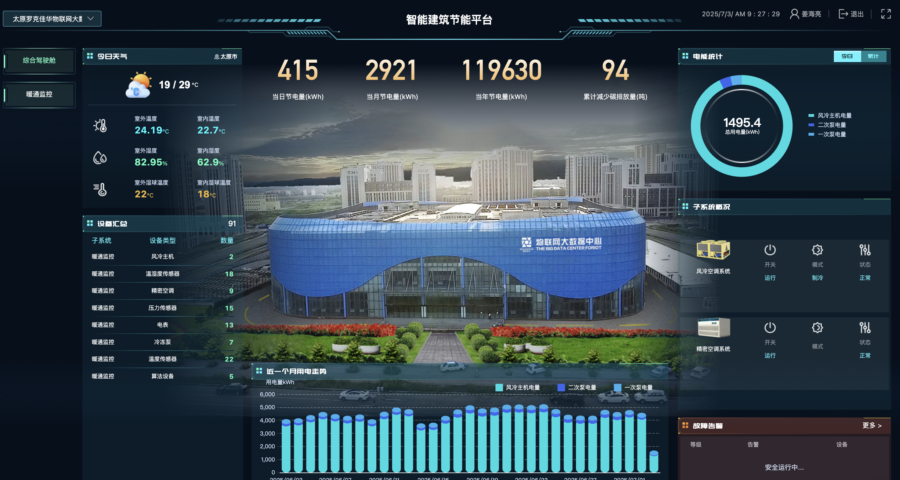 通过物联网技术实现中央空调、照明、供水、供电等系统的全面接入与数据采集,构建建筑能耗的数字孪生模型。系统可实时监测能耗状态与运行效率,为节能调控提供精准依据。
